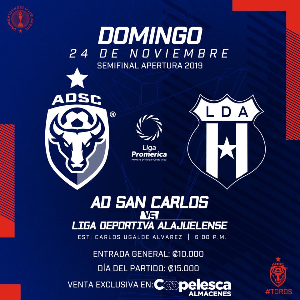 El encuentro de ida de «Semifinal» será el próximo domingo 24 de noviembre a las 6:00 p.m en el estadio Carlos Ugalde Álvarez. La entrada es general con un costo de ₡10.000 adquirida previamente, ya que el día del partido tendrá un valor de ₡15.000. Se pueden adquirir en Coopelesca Almacenes. Los derechos de transmisión corresponden a TigoSports.