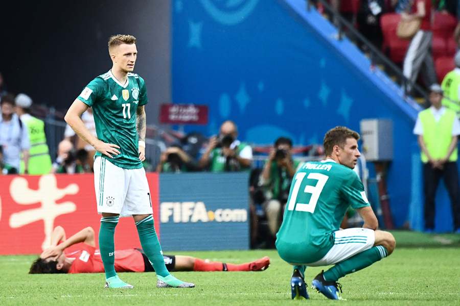 Germany's forward Marco Reus (L) and Germany's forward Thomas Mueller (R) react at the end of the Russia 2018 World Cup Group F football match between South Korea and Germany at the Kazan Arena in Kazan on June 27, 2018. / AFP PHOTO / Jewel SAMAD / RESTRICTED TO EDITORIAL USE - NO MOBILE PUSH ALERTS/DOWNLOADS