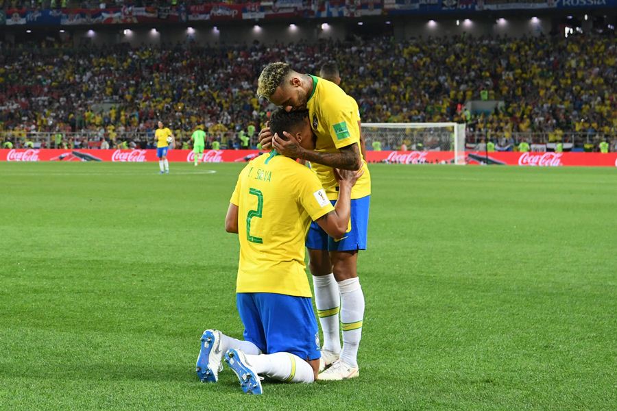 Brazil's defender Thiago Silva (L) is congratulated for his goal by Brazil's forward Neymar during the Russia 2018 World Cup Group E football match between Serbia and Brazil at the Spartak Stadium in Moscow on June 27, 2018. / AFP PHOTO / Kirill KUDRYAVTSEV / RESTRICTED TO EDITORIAL USE - NO MOBILE PUSH ALERTS/DOWNLOADS
