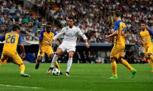 Tras una de estas recuperaciones, Marcelo centro desde la izquierda al segundo palo, donde cabeceó Bale y Sergio Ramos remató...