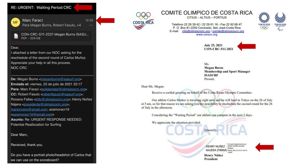 - El Presidente de la Federación de Surf de Costa Rica, Mario Ríos, le indica al Presidente del Comité Olímpico que le han informado de la Federación Internacional que si se envía una solicitud del Comité Olímpico Nacional podrían atrasar el segundo heat. A las 12:36 p. m. (hora de Tokio) del 25 de julio el Presidente del CON envía la misiva CON-CRC-511-2021 solicitando a la Federación Internacional de Surf aplazar el heat del atleta Carlos Muñoz. El CON no recibe respuesta, ya que nunca fue una posibilidad real que la organización aplazara la programación de un evento olímpico por un atleta.