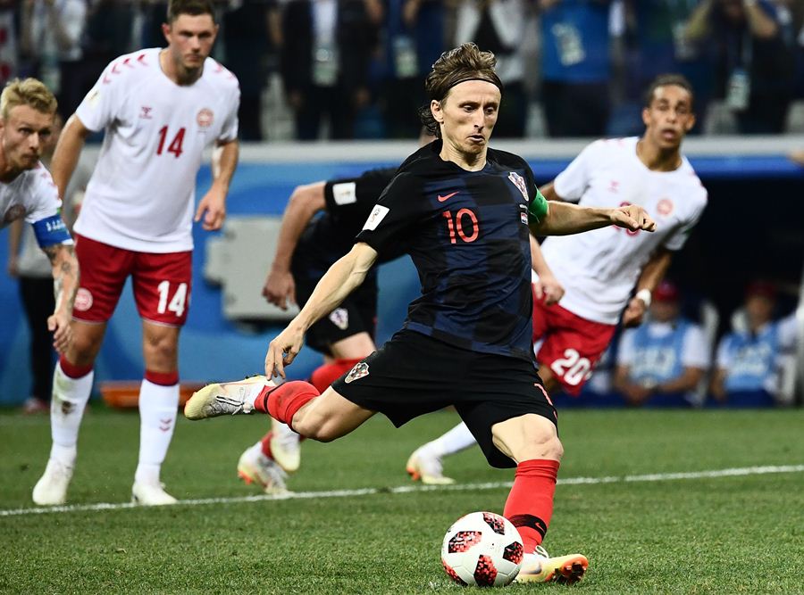 Croatia's midfielder Luka Modric takes a penalty kick that was saved during the Russia 2018 World Cup round of 16 football match between Croatia and Denmark at the Nizhny Novgorod Stadium in Nizhny Novgorod on July 1, 2018. / AFP PHOTO / Jewel SAMAD / RESTRICTED TO EDITORIAL USE - NO MOBILE PUSH ALERTS/DOWNLOADS