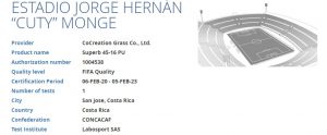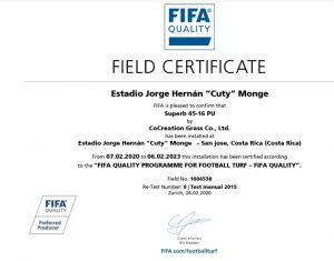 En el mes de setiembre del 2018 la Municipalidad invirtió cerca de 200 millones de colones en el cambio de la gramilla, donde se incluyó la nueva tecnología de absorción de impactos “Shock Pad”. Pero más allá de los productos utilizados, FIFA evalúa rigurosamente la calidad del trabajo realizado en la colocación de la grama, con pruebas, tanto de laboratorio como de campo. Todo esto para finalmente ser reconocidos, obteniendo la certificación “FIFA Quality” que garantiza el desarrollo del fútbol de alto nivel en la cancha del «Cuty» Monge.