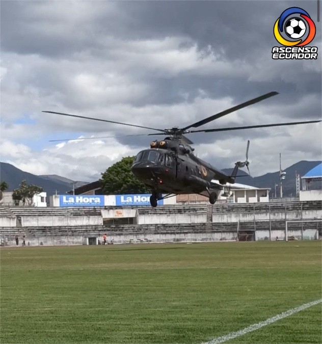 Un helicóptero aterrizó este martes en un estadio de la ciudad andina de Ibarra, en el norte de Ecuador, e interrumpió un partido del torneo de ascenso entre el Independiente y La Cantara.