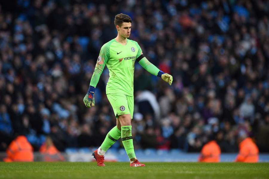Chelsea's Spanish goalkeeper Kepa Arrizabalaga reacts during the English Premier League football match between Manchester City and Burnley at the Etihad Stadium in Manchester, north west England, on February 10, 2019. (Photo by Oli SCARFF / AFP) / RESTRICTED TO EDITORIAL USE. No use with unauthorized audio, video, data, fixture lists, club/league logos or 'live' services. Online in-match use limited to 120 images. An additional 40 images may be used in extra time. No video emulation. Social media in-match use limited to 120 images. An additional 40 images may be used in extra time. No use in betting publications, games or single club/league/player publications. /