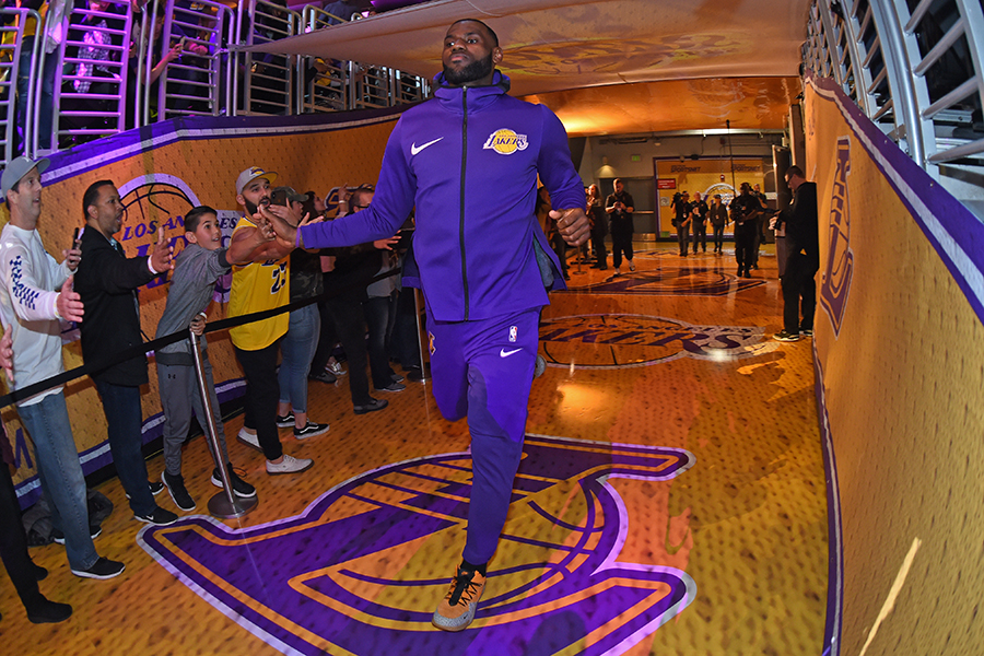 LOS ANGELES, CA - MARCH 1: LeBron James #23 of the Los Angeles Lakers enters the arena prior to a game against the Milwaukee Bucks on March 1 2019 at STAPLES Center in Los Angeles, California. NOTE TO USER: User expressly acknowledges and agrees that, by downloading and/or using this Photograph, user is consenting to the terms and conditions of the Getty Images License Agreement. Mandatory Copyright Notice: Copyright 2019 NBAE Andrew D. Bernstein/NBAE via Getty Images/AFP
