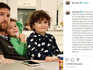 «Es el momento de ser responsable y quedarse en casa, además es perfecto para disfrutar ese tiempo con los tuyos que no siempre se puede tener», escriibió Messi, quien por su cuenta de Instagram publicó una foto con sus dos hijos Thiago y Mateo.